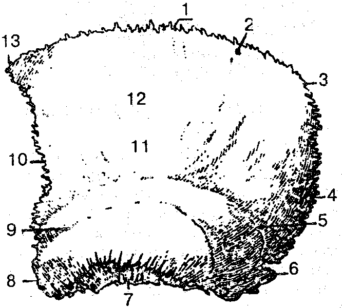 1 — сагиттальный край; 2 — теменное отверстие; 3— затылочный угол; 4 — затылочный край; 5 — верхняя височная линия; 6 — сосцевидный угол; 7— чешуйчатый край; 8— клиновидный угол; 9— нижняя височная линия; 70— лобный край; 11 — теменной бугор; 12— наружная поверхность; 13 — лобный угол