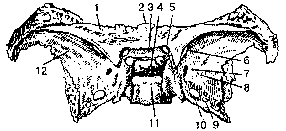 1 — малое крыло (левое); 2 — тело; 3 — предперекрестная борозда; 4 — ги-пофизарная ямка; 5— зрительный канал; 6— верхняя глазничная щель; 7— круглое отверстие; 8, 12— большие крылья; 9— овальное отверстие; 10— остистое отверстие; 11— спинка седла