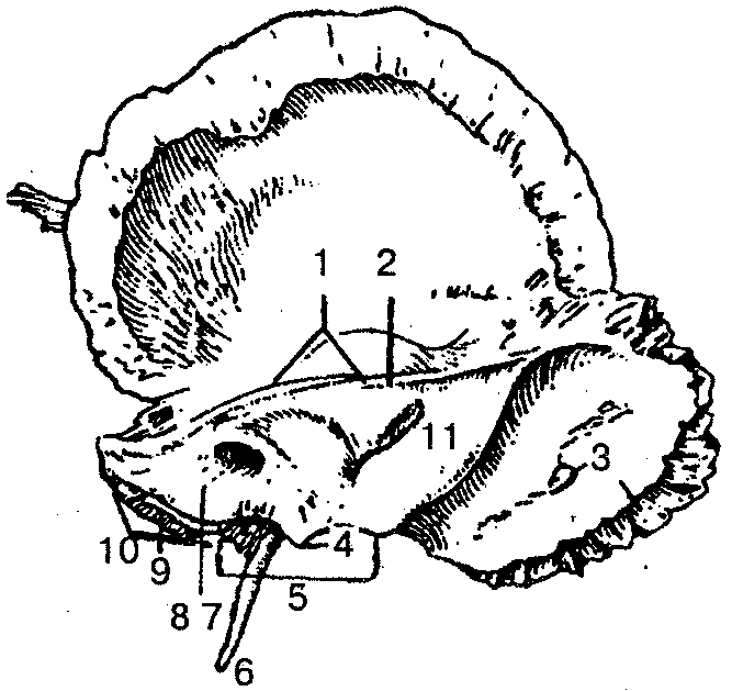 1 — верхний край пирамиды; 2 — борозда верхнего каменистого синуса; 3 — борозда сигмовидного синуса; 4 — внутренний отросток; 5 — яремная вырезка; 6 — шиловидный отросток; 7— внутреннее слуховое отверстие;.?— внутренний слуховой проход; 9 — борозда нижнего каменистого синуса; 10— задний край пирамиды; 11— задняя поверхность пирамиды