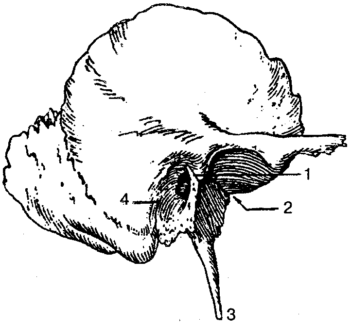 1 — барабанно-чешуйчатая щель; 2 — каменисто-барабанная щель; 3— шиловидный отросток; 4 — барабанно-сосцевидная щель