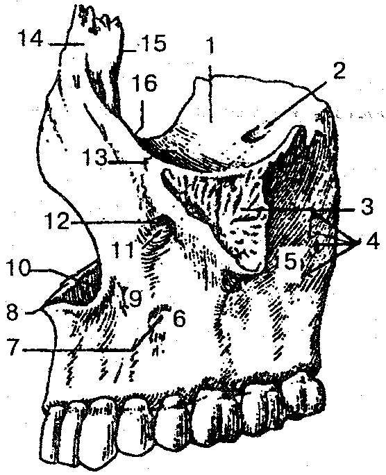 1 — глазничная поверхность; 2 — подглазничная борозда; 3 — скуловой отросток; 4— альвеолярные отверстия; 5 — подвисочная поверхность; 6 — передняя поверхность; 7— клыковая ямка; 8 — передняя носовая ость; 9 — тело верхней челюсти; 10— носовая вырезка; 11 — подглазничный канал; 22 — подглазничное отверстие; 13 — скуловерхнечелюстной шов; 14 — лобный отросток; 15 — слезный край; 16— подглазничный край