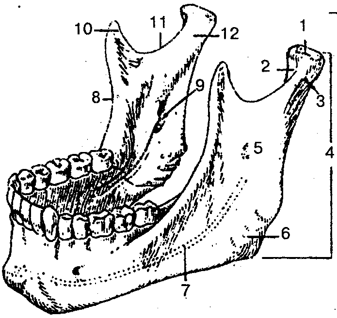 I — головка нижней челюсти; 2 — крыловидная ямка; 3 — шейка нижней челюсти; 4, 5 — ветви нижней челюсти; б—угол нижней челюсти; 7— канал нижней челюсти; 8 — височный гребень; 9 — отверстие нижней челюсти; 10— венечный отросток; II — вырезка нижней челюсти; 12— мыщелковый отросток
