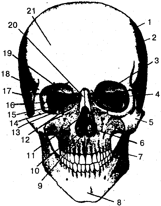 1 — венечный шов; 2 — теменная кость; 3 — глазничная часть лобной кости; 4 — глазничная поверхность большого крыла, клиновидной кости; 5— скуловая кость; 6— нижняя носовая раковина; 7— верхняя челюсть; 8— подбородочный выступ нижней челюсти; 9 — полость носа; 10— сошник; 11— перпендикулярная пластинка решетчатой кости; 12— глазничная поверхность верхней челюсти; 13 — нижняя глазничная щель; 14 — слезная кость; 15 — глазничная пластинка решетчатой кости; 16 — верхняя глазничная щель; 17— чешуйчатая часть височной кости; 18— скуловой отросток лобной кости; 19— зрительный канал; 20— носовая кость; 21 — лобный бугор