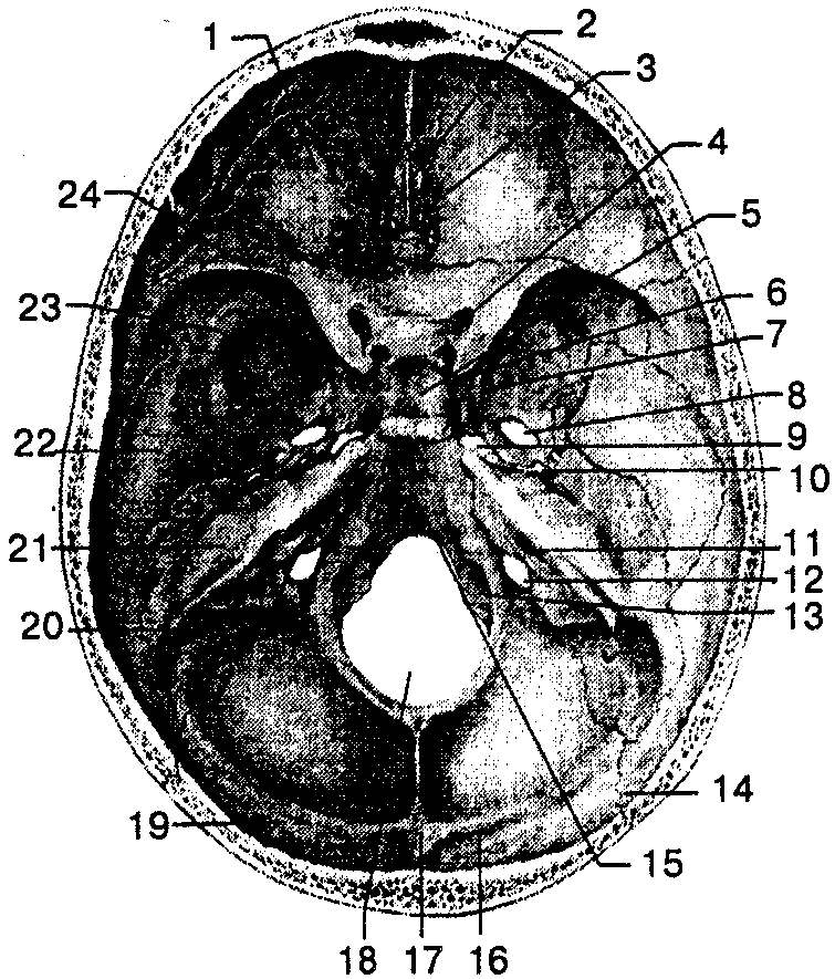 1 — глазничная часть лобной кости; 2 — петушиный гребень; 3 — решетчатая пластинка; 4— зрительный канал; 5 — гипофизар-ная ямка;. 6— спинка седла; 7 — круглое отверстие; 8 — овальное отверстие; 9 — рваное отверстие; 10— остистое отверстие; 11 — внутреннее слуховое отверстие; 12 — яремное отверстие; 13 — подъязычный канал; 14 — лямбдовидный шов; 75 — скат; 16 — борозда поперечного синуса; 77—внутренний затылочный выступ; 18 — большое (затылочное) отверстие; 19 — затылочная чешуя; 20 — борозда сигмовидного синуса; 21 — пирамида (каменистая часть) височной кости; 22 — чешуйчатая часть височной кости; 23 — большое крыло клиновидной кости; 24 — малое крыло клиновидной кости