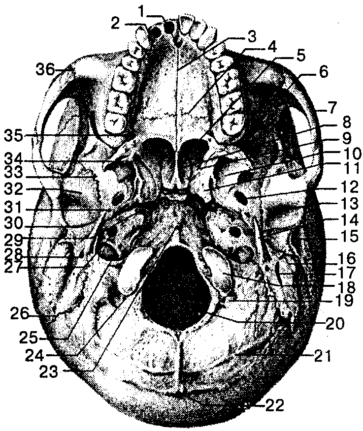 1 — нёбный отросток верхней челюсти; 2— резцовое отверстие; 3 — срединный нёбный шов; 4 — поперечный нёбный шов; 5— хоана; б— нижняя глазничная щель; 7— скуловая дуга; 8 — крыло сошника; 9— крыловидная ямка; 10 — латеральная пластинка крыловидного отростка; 77— крыловидный отросток; 12 — овальное отверстие; 13 — нижнечелюстная ямка; 14— шиловидный отросток; 15 — наружный слуховой проход; 16— сосцевидный отросток; 77— сосцевидная вырезка; 18— затылочный мыщелок; 19 — мыщелковая ямка; 20— большое (затылочное) отверстие; 27 — нижняя выйная линия; 22— наружный затылочный выступ; 23 — глоточный бугорок; 24 — мыщелковый ка-.нал; 25— яремное отверстие; 26— затылочно-сосцевидный шов; 27— наружное сонное отверстие; 28— шилососцевидное отверстие; 29— рваное отверстие; 30 — каменисто-барабанная щель; 31 — остистое отверстие; 32 — суставной бугорок; 33 — клиновидно-чешуйчатый шов; 34 — крыловидный крючок; 35— большое нёбное отверстие; 36— скуловерхнечелюстной шов