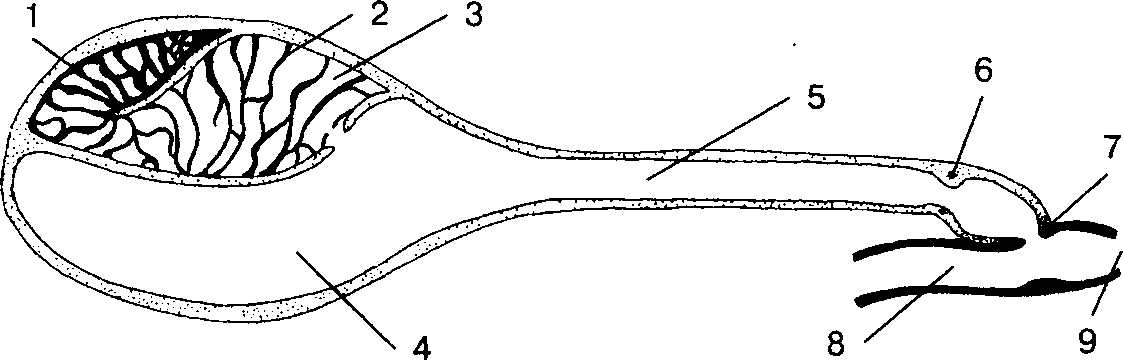 1 – зона образования железистых складок; 2 – железистые складки; 3 – железистый отдел; 4 – резервуар; 5 – проток чернильного мешка; 6 – внутренний сфинктер (клапан); 7 – наружный сфинктер; 8 – прямая кишка; 9 – анальное отверстие