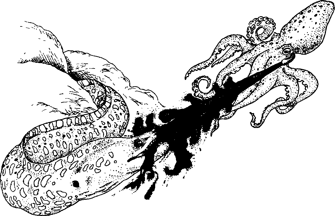 Когда головоногому моллюску угрожает опасность, он выпускает прямо перед глазами врага чернильную «бомбу» – ту самую жидкость, которая вырабатывается чернильной железой. Существует мнение, что возникающее чернильное облако даже имеет форму осьминога. Хищник бросается на него, но не только не ловит моллюска, но и оказывается полностью дезориентирован в пространстве. Есть предположение, что вещества, содержащиеся в чернильной «бомбе», на мгновения или парализуют врага, или притупляют его обоняние. Выиграв время, головоногий хитрец успевает уплыть или спрятаться.