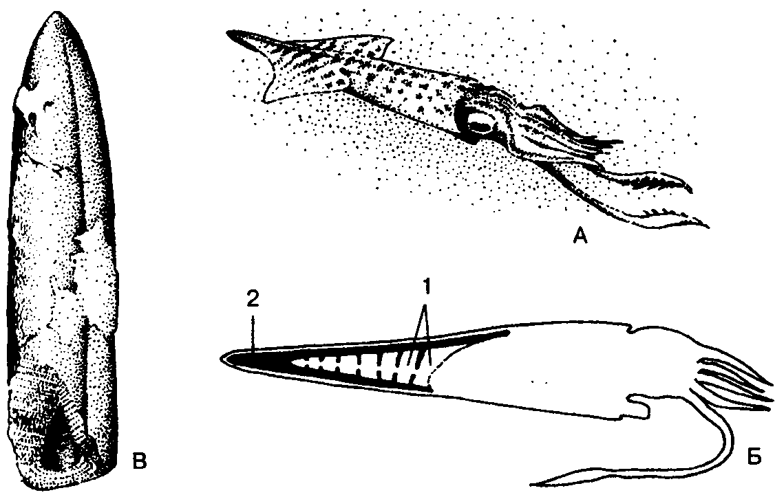 Белемниты:А – общий вид (реконструкция); Б – расположение раковины в теле моллюска (1 – камеры; 2 – ростр); В – ископаемый остаток ростра («чёртов палец»)