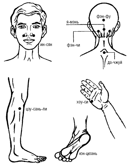 Точечный массаж выполняется по тормозной, седативной, расслабляющей методике. Желательно манипуляции на голове выполнять с одновременным наклоном головы массируемого назад (рис. 94).