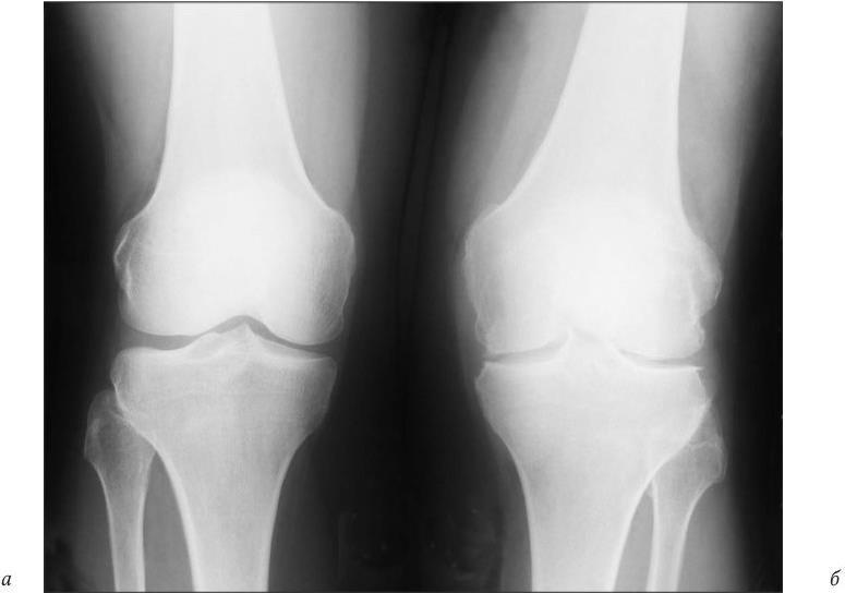 а — головка большеберцовой кости имеет ровные округлые контуры; б — в коленном суставе видна четкая краевая деструкция, узурация эпифиза большеберцовой кости