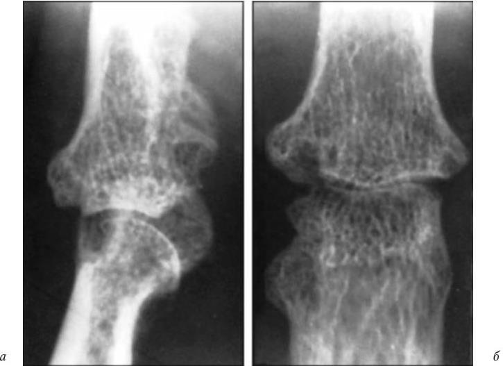 Глубокие краевые дефекты костной ткани, деструкция костной ткани в головке и основании пястно-фалангового сустава (а — боковая проекция; б — прямая проекция)