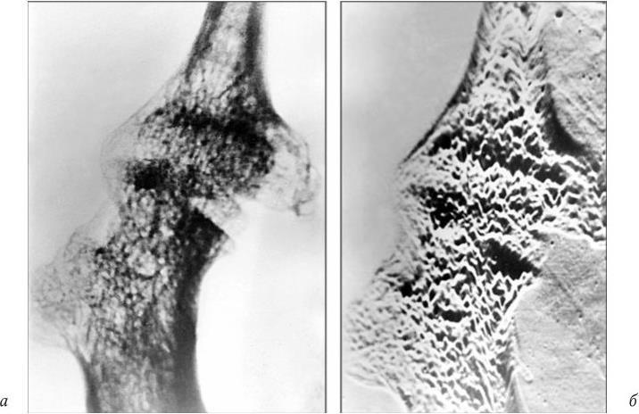 Рис. 16. Рентгенограмма пястно-фалангового сустава больной РА, III стадия, 6-кратное увеличение рентгеновского изображения