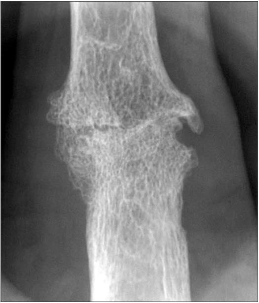 Рис. 19. Рентгенограмма проксимального межфалангового сустава II пальца правой кисти. Сочетание ОА и РА. Прямое 7-кратное увеличение рентгеновского изображения. Диффузный остеопороз