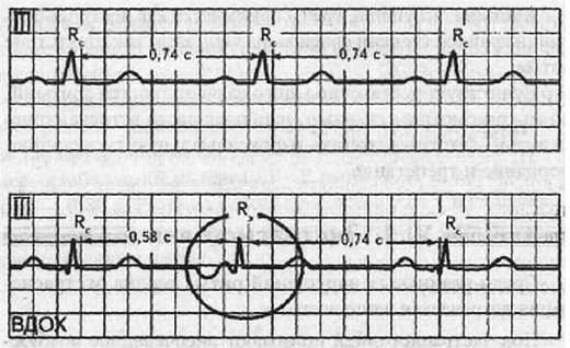 Поскольку экстрасистола — это внеочередное возбуждение, то на ЭКГ ленте месторасположение ее будет раньше предполагаемого очередного синусового импульса. Поэтому пред экстрасистолический интервал, т. е. интервал R(синусовый) — R(экстрасистолический) будет меньше интервала R(синусовый) — R(синусовый).