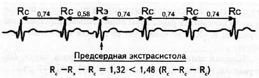 При нахождении гетеротопного очага возбуждения в предсердиях импульс, выходящий из него, нарушает ритмичную работу синусового узла. Этот импульс «разряжает» до нуля электрический потенциал синусового узла, работа которого начинается как бы с новой точки отсчета. Поэтому следующий после экстрасистолы синусовый импульс возникает через промежуток времени, в течение которого происходит восстановление потенциала синусового узла. Этот промежуток (постэкстрасистолический интервал) равен продолжительности нормального синусового интервала R—R.