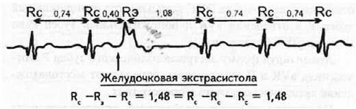 Один из этих синусовых импульсов, приходя к желудочкам, застает их в состоянии возбуждения от экстрасистолического импульса: они не могут ответить на синусовый импульс в этот момент. На ЭКГ ленте регистрируется экстрасистолический, а не синусовый желудочковый комплекс QRS. Желудочки сердца ответят на следующий после экстрасистолы синусовый импульс, и таким образом при сложении пред- и постэкстрасистолических интервалов получается значение, равное двум нормальным интервалам R—R.