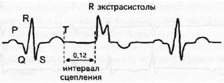 Под интервалом сцепления экстрасистолы понимают интервал между окончанием процессов реполяризации (конец зубца Т) и началом экстрасистолы (зубец R).