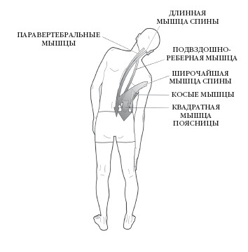 В основном за осуществление наклона в сторону в грудопоясничном отделе отвечают квадратная мышца поясницы и паравертебральные мышцы. Чем больше усилий прилагается для производства движения, тем выше вовлеченность и уровень сокращения вспомогательных мышц, участвующих в данном движении (подвздошнореберной, длинной мышцы спины, широчайшей мышцы спины и косых мышц живота).