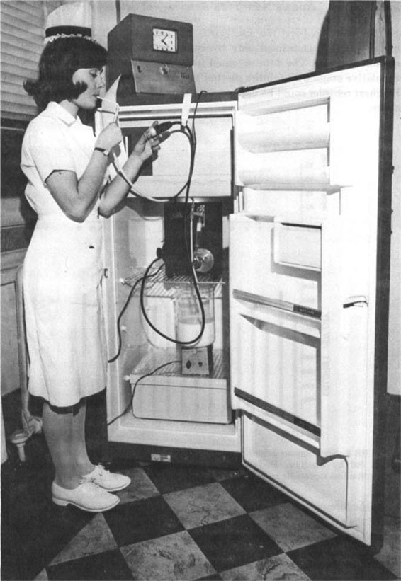 Рис. 15. Медсестра тестирует пищевой аппарат. Обратите внимание на трубочку, кнопку и ее смешной головной убор. Взято из работы Хашима и др., журнал «Annals of the New York Academy of Sciences» 131 (1965): 654, с разрешения компании John Wiley and Sons.
