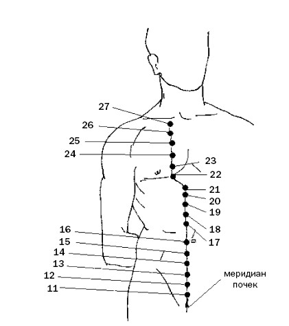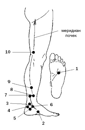 Меридиан почек функционально связан с мочевым пузырем, легкими, сердцем. Активен с 17 до 19 часов. На симметричных меридианах почек описано по 27 точек. Главные точки меридиана: возбуждающая точка – 7 Фу-лю, успокаивающая точка – 1 Юн-цюань, противоболевые точки – 5 Шуй-цюань, 8 Цзяо-синь, 9 Чжу-бинь.