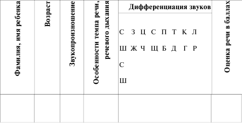 Результаты исследования заносятся в таблицу, где знаком (+) отмечается правильное произношение, умение дифференцировать звуки, регулировать темп речи и дыхания; знаком (—) пропуск звуков, отсутствие их дифференциации, нарушения в регулировании темпов речи.