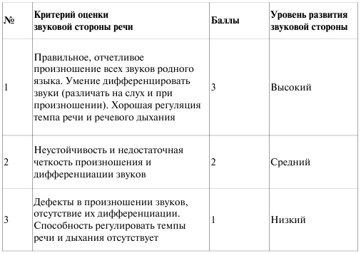 В таблице приводятся примерные оценки звуковой стороны речи детей. Высокому уровню развития соответствует высший балл, равный 3; 2 балла — среднему уровню развития; 1 балл соответствует низкому уровню развития звуковой стороны речи детей.