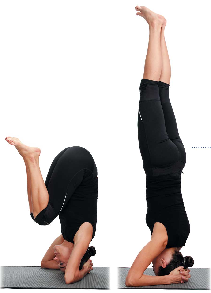 Вес тела целиком приходится на опорную точку на голове – руки только помогают балансировать. Признаком того, что тело и конечности установлены правильно, будет субъективное ощущение потери веса (состояние невесомости) без какого-либо ощутимого напряжения во всем теле – именно таким образом достигается устойчивое положение. Стремитесь немного вытягивать ноги и туловище вверх, добиваясь тем самым некоторого осевого вытяжения позвоночника.