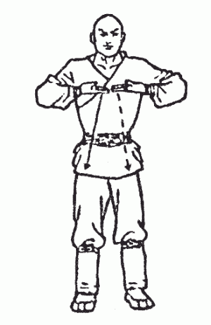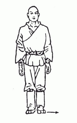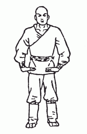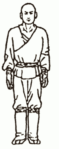1. Поставить ноги вместе, встать прямо. Плотно сжать ладони и опустить руки вдоль тела, прижимая ладони к внешним поверхностям бедер (рис. 1).