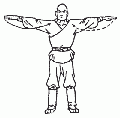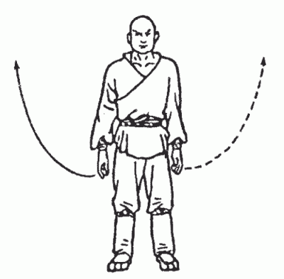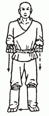 6. Развернуть обе руки внутрь вокруг их осей «сердцами» ладоней вниз и, производя нажимающее движение, опустить ладони к животу. При этом расположить кончики пальцев друг против друга. Одновременно воздух должен опуститься в средний «даньтянь». Смотреть вперед (рис. 6).