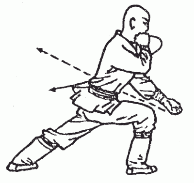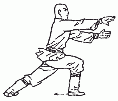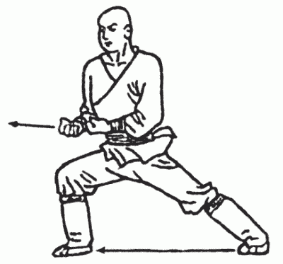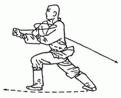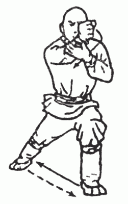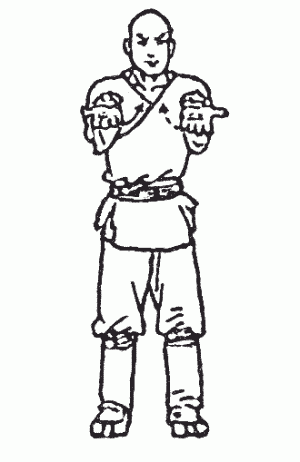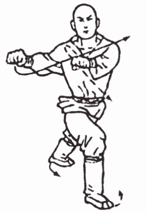 1. Сместить назад центр тяжести, согнуть правое колено. Затем придвинуть к себе на полшага левую ногу, ставя ее на носок и сгибая в колене. Принять левостороннюю стойку сюйбу. Одновременно развернуть обе руки наружу вокруг их осей и свести перед туловищем, перемещая вниз и назад и оставляя руки согнутыми в локтях. Кулаки развернуть «сердцами» вверх, причем левый кулак расположить чуть выше груди, а правый подвести к внутренней поверхности левого локтя. Смотреть вперед (рис. 30).