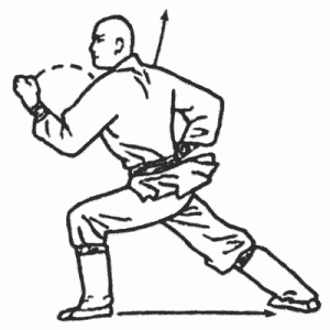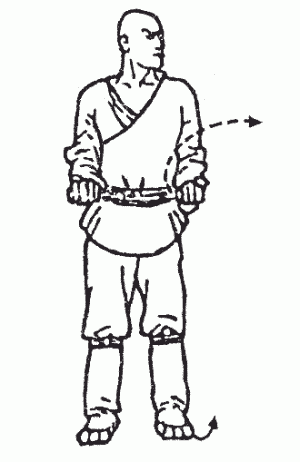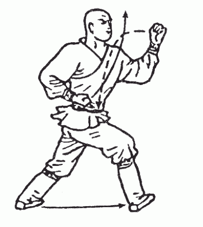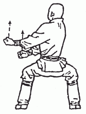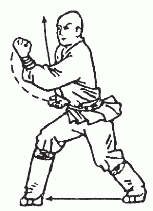 Левую стопу подвести к внутренней поверхности правой стопы и поставить первую на носок. Правое колено согнуть и принять левостороннюю Т-образную стойку. Левый кулак опустить вниз, расположив его в 5–6 см от пупка «сердцем» вниз и «глазом» внутрь. Правый кулак перевести в «подпирающее» положение справа над головой. Смотреть влево и вперед (рис. 131).
