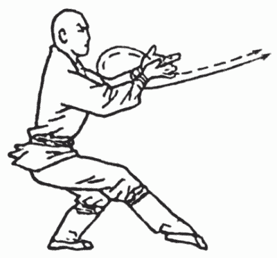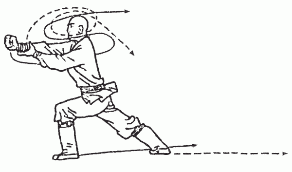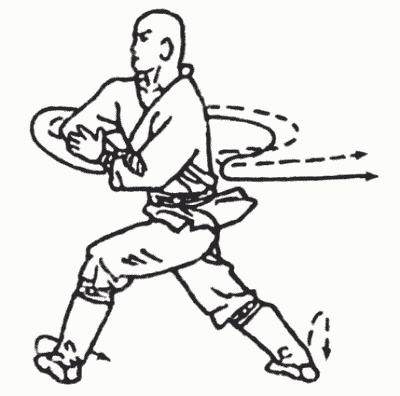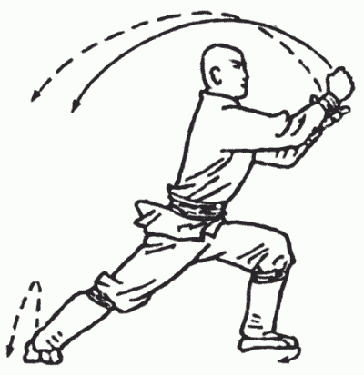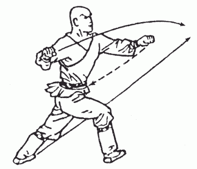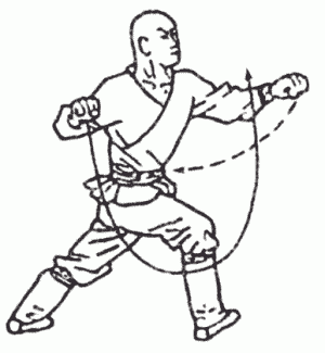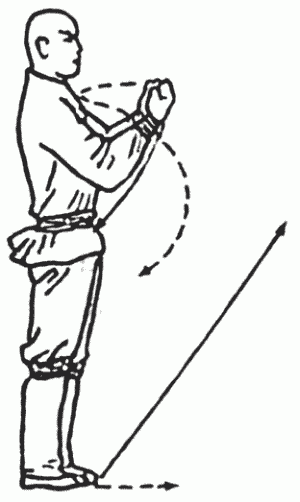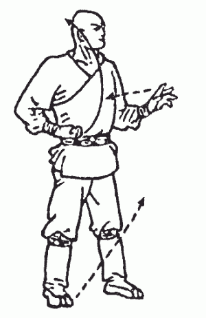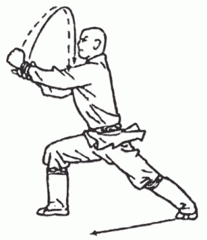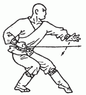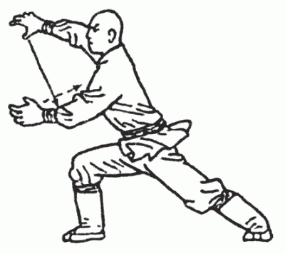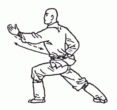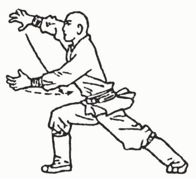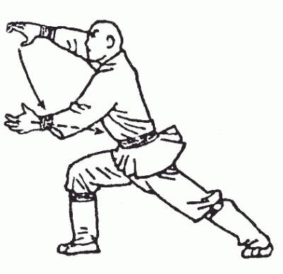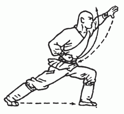 1. Развернуть левую стопу носком наружу. Одновременно левый кулак раскрыть в ладонь и развернуть руку внутрь вокруг ее оси, «сердцем» ладони вниз. Затем, сосредоточивая усилие на внешнем ребре ладони, описать левой ладонью дугу в вертикальной плоскости вверх, влево и вниз, после чего расположить ладонь «сердцем» вправо и кончиками пальцев вперед. Смотреть влево и вперед (рис. 8).