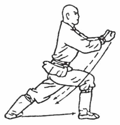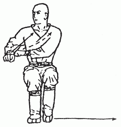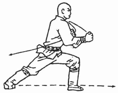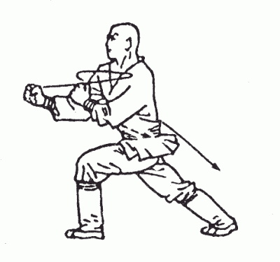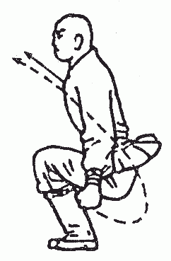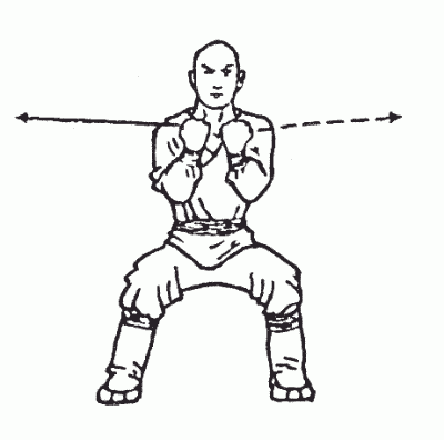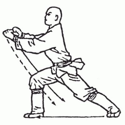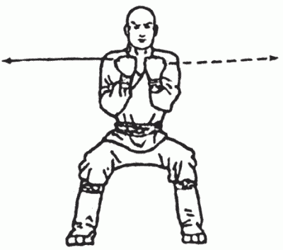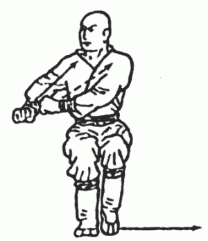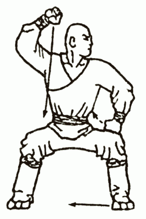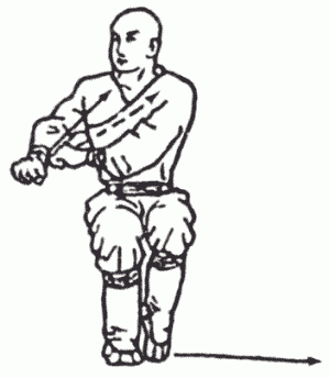 3. Продолжая движение, согнуть ноги в коленях и принять стойку мабу. Одновременно отвести влево левый кулак «сердцем» вверх. Правый кулак опустить «сердцем» влево к наружной поверхности левого колена, нанося при этом «расплющивающий» удар «ободом» кулака. Смотреть на правый кулак (рис. 41).