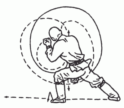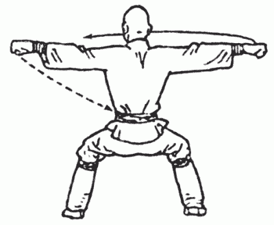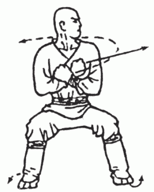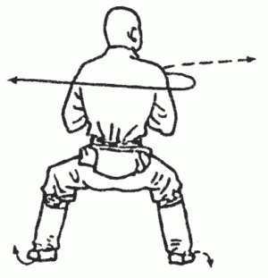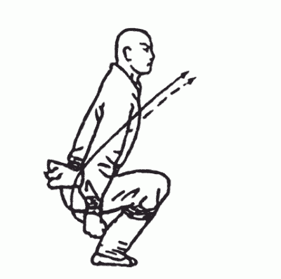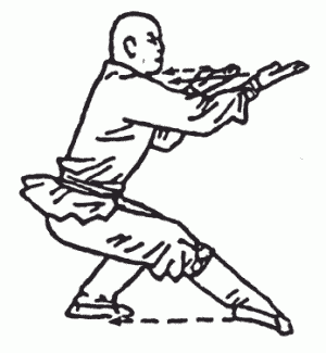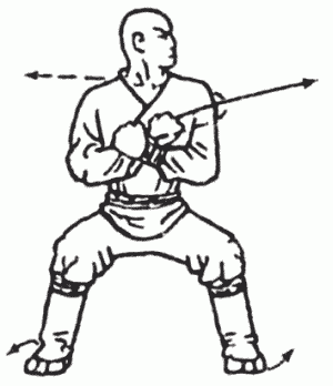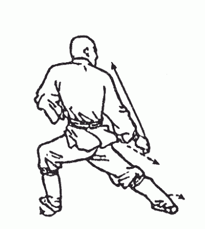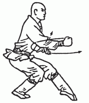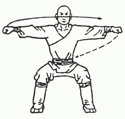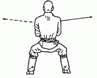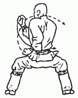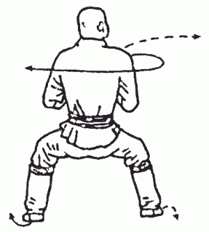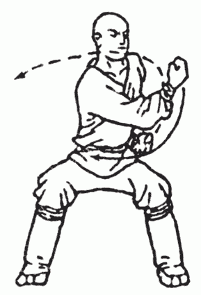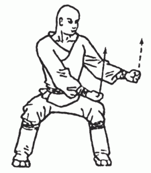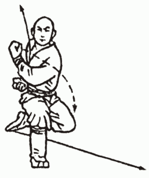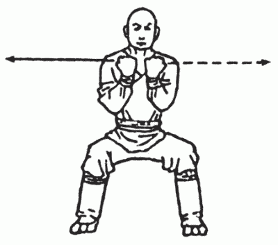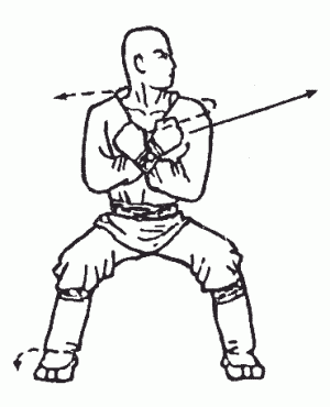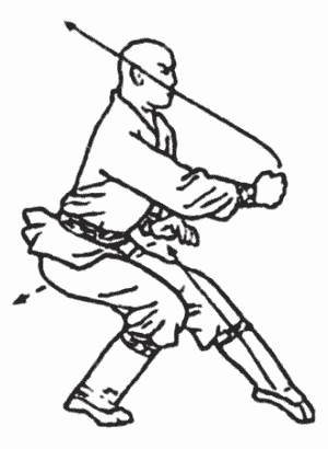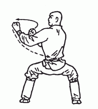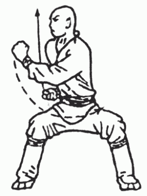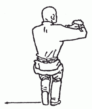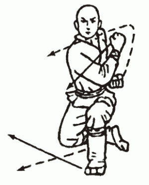 3. Продолжая движение, согнуть ноги в коленях и принять стойку мабу. Одновременно отвести влево левый кулак «сердцем» вверх. Правый кулак опустить «сердцем» влево к наружной поверхности левого колена, нанося при этом «расплющивающий» удар «ободом» кулака. Смотреть на правый кулак (рис. 15).