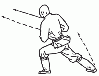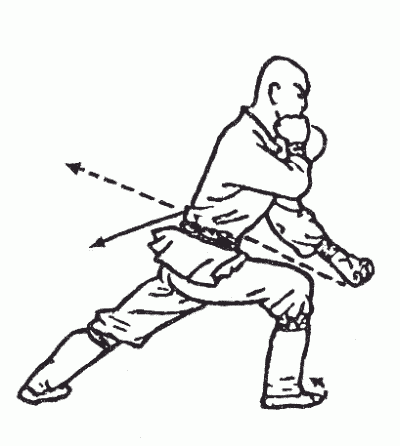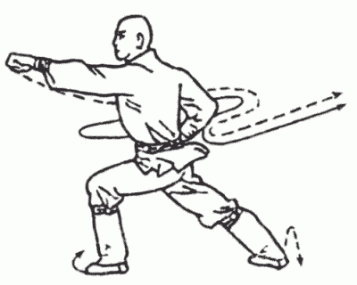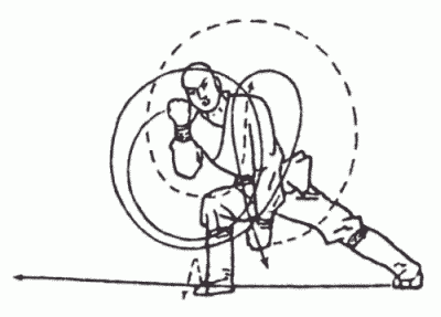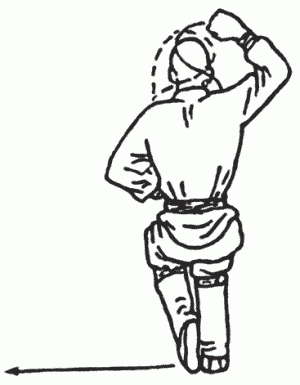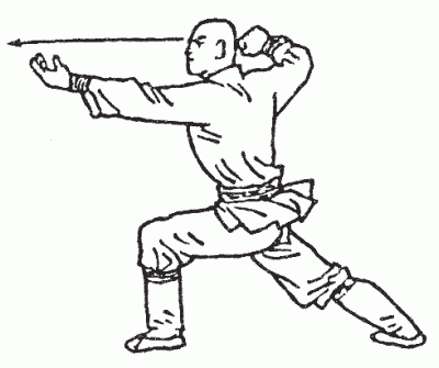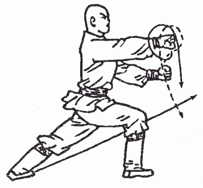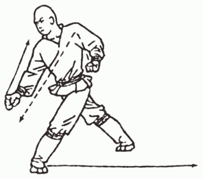 2. Правую ногу поставить на землю перед собой и согнуть в колене. Левую ногу выпрямить в колене и принять правостороннюю стойку гунбу. Одновременно левый кулак поднять к середине груди «глазом» вверх и толкнуть вправо левым локтем, разворачивая последний «острием» вперед. Правый кулак перевести вправо, назад, вверх и вперед в «подпирающее» положение справа над головой, «глазом» вниз. Развернуть туловище вправо. Смотреть вперед (рис. 122).