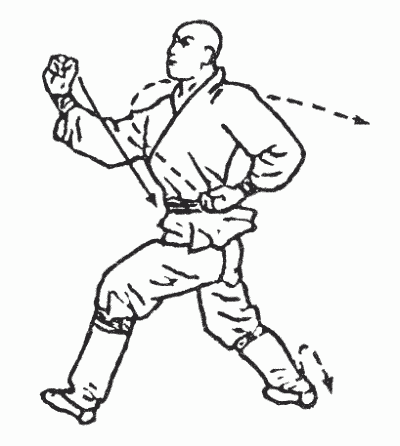 1. Сделать полшага вперед левой ногой, оставляя ее слегка согнутой в колене, а правой ногой нанести прямой удар влево и вперед, оттягивая носок вверх. В это же время правый кулак поднести к левому плечу, а затем опустить его вправо и вниз по касательной к наружной поверхности правого бедра, совершая при этом «раскалывающий» удар «ободом» кулака. Левый же кулак отвести на пояс. Смотреть вперед (рис. 31).