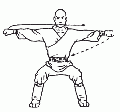 3. Повернуться на 90° вправо на правой пятке и левой подошве. Правое колено согнуть, левое выпрямить и принять правостороннюю стойку гунбу. Одновременно с разворотом развести в стороны согнутые в локтях руки, располагая правый кулак чуть ниже, а левый – чуть выше линии плеч, нанося при этом горизонтальные боковые удары «ободами» кулака, направляя «сердца» кулаков вниз. Смотреть вправо и вперед (рис. 33).