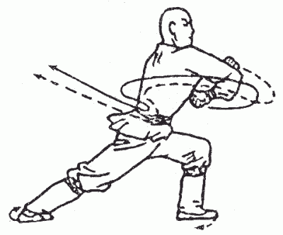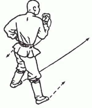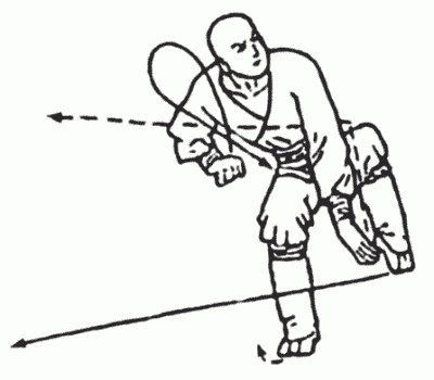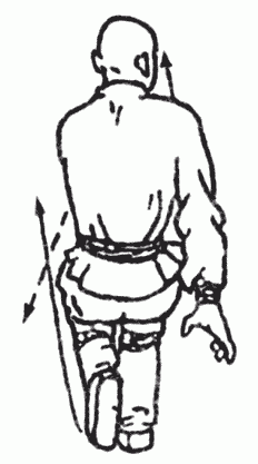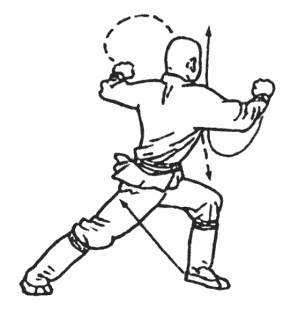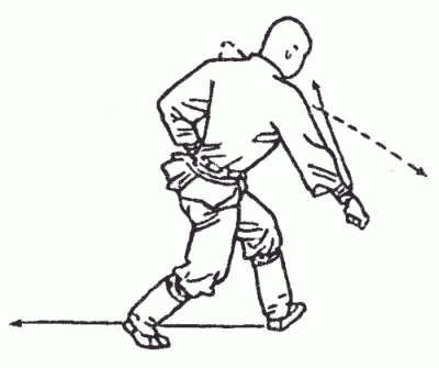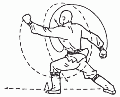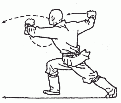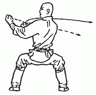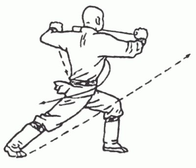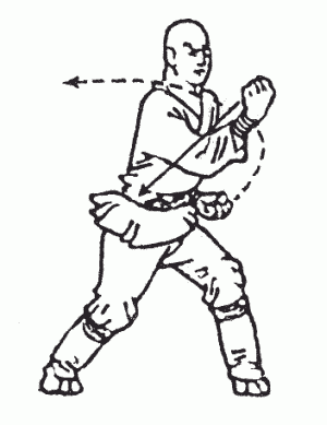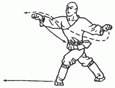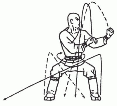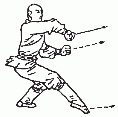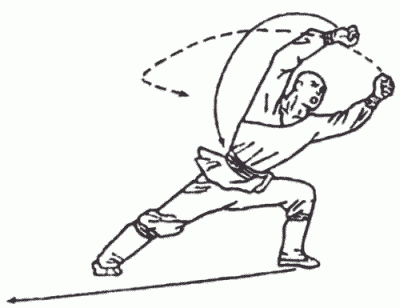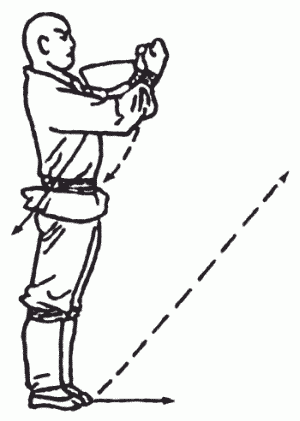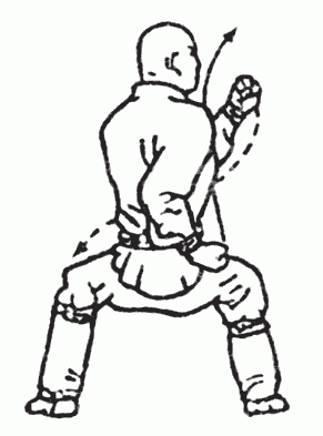 1. Оставаясь на том же месте, перевести правый кулак к левому плечу и опустить его вправо, вниз и назад, нанося «ободом» кулака «расплющивающий» удар на уровне бедра и располагая кулак «сердцем» внутрь. Левую кисть сжать в кулак и отвести его на пояс «сердцем» вверх. Смотреть на правый кулак (рис. 13).
