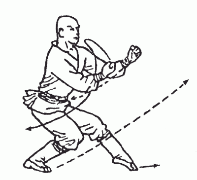 2. Не останавливаясь, убрать левую ногу на шаг влево и выпрямить ее в колене. Правую ногу согнуть в колене и принять правостороннюю стойку гунбу. В это же время левый кулак поднять к левому плечу и опустить вниз, нанося «расплющивающий» удар «ободом» кулака на уровне колена и располагая кулак «сердцем» наружу. Правый же кулак поднять к правому плечу. Смотреть на левый кулак (рис. 40).