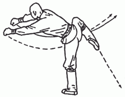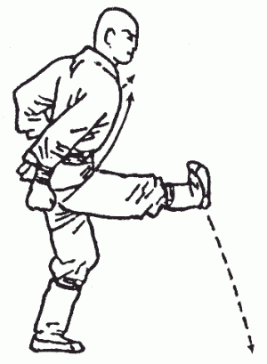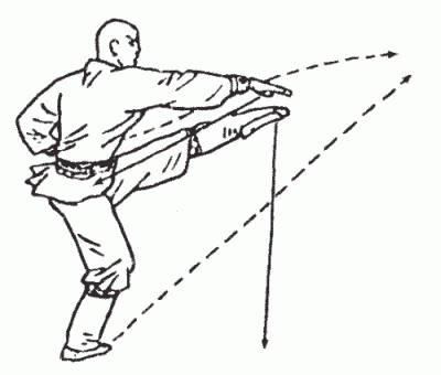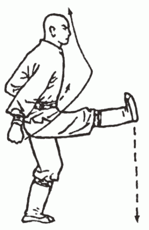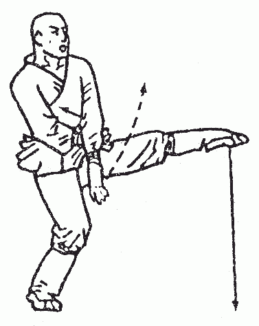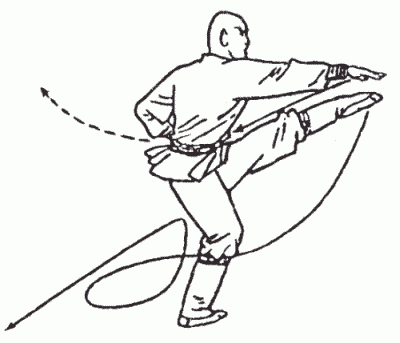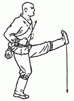 1. Выпрямить правую ногу и перенести на нее вес тела. Левой ногой выполнить эластичный удар вперед и вверх, оттягивая носок вперед.