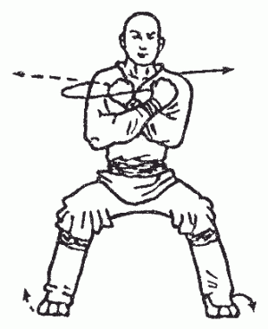 2. Поставить на землю перед собой правую ногу, повернуться на 90° влево, согнуть колени и принять стойку мабу. Одновременно скрестить предплечья перед грудью. Причем снаружи расположить правое предплечье, а «сердца» кулаков развернуть внутрь по диагонали. Смотреть вправо и вперед (рис. 32).
