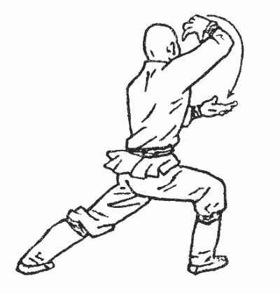 3. Продолжая движение, поставить на землю слева левую ногу, согнуть колени и принять стойку мабу. В это же время, разворачивая левое предплечье внутрь вокруг его оси, перевести левый кулак в «опрокинутое» положение справа над головой, «сердцем» вперед и «глазом» вниз. Движения руками сопровождать криком «вэй». Смотреть вперед (рис. 154).