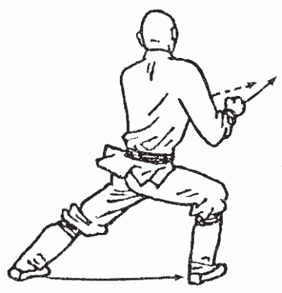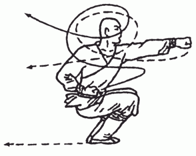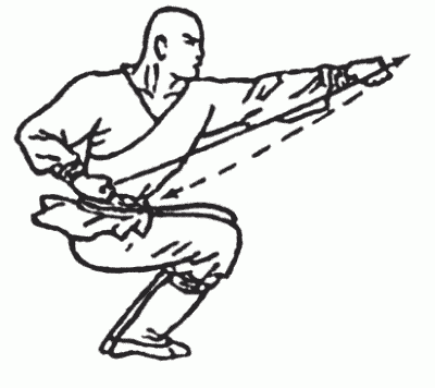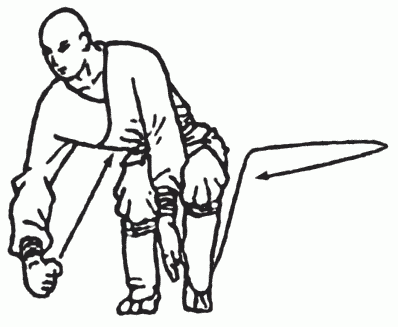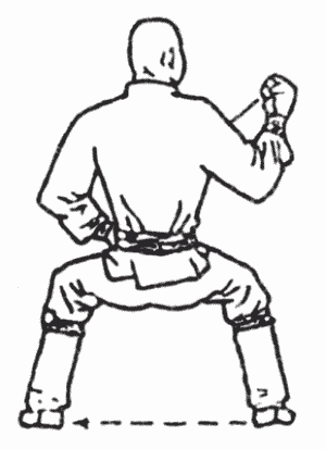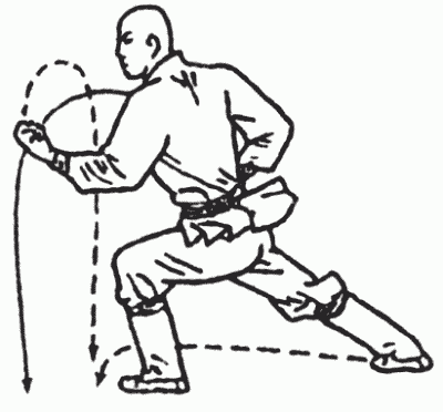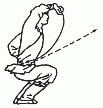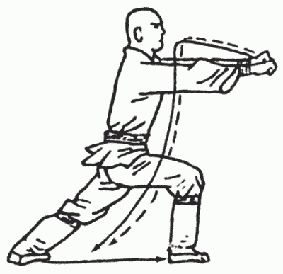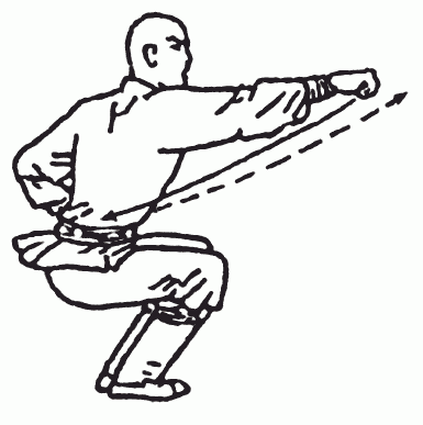 Сделать правой ногой «накрывающий» шаг перед левой стопой и повернуться влево на 90°. Согнуть оба колена, поставить на носок левую стопу у внутренней поверхности правой стопы и принять левостороннюю Т-образную стойку. В это же время поднять правый кулак к правому плечу и сразу опустить его вдоль внешней поверхности правого бедра, нанося при этом «ободом» кулака «расплющивающий» удар и касаясь «ободом» земли, а также разворачивая кулак «сердцем» влево. Левый же кулак отвести на пояс. Смотреть на правый кулак (рис. 128).