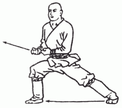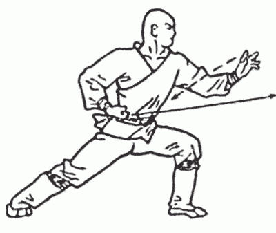 1. Развернуться на правой пятке и левой подошве влево на 180° и сделать полшага вперед левой ногой, наполовину сгибая ее в колене. Правую ногу выпрямить и принять левостороннюю стойку гунбу. Одновременно с разворотом перевести левую руку по дуге вниз, влево и вверх, располагая ладонь «сердцем» вправо и кончиками пальцев вперед. Правый кулак отвести на пояс. Смотреть на левую ладонь (рис. 11).
