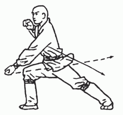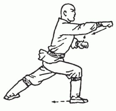 3. После небольшой паузы поставить правую ногу перед собой и согнуть в колене. Левую ногу выпрямить и принять правостороннюю стойку гунбу. Одновременно развернуть правое предплечье наружу вокруг его оси и опустить правый кулак с «размалывающим» движением «сердцем» вверх. Левую ладонь прижать ко внутренней поверхности правого предплечья. Смотреть вперед (рис. 10).
