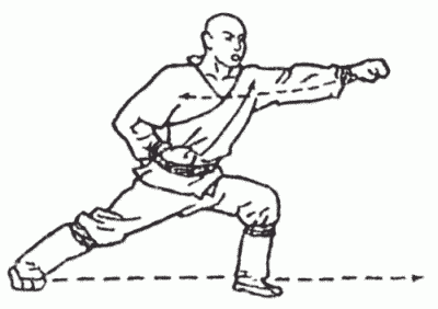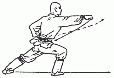 Приподнять правую стопу и снова поставить на прежнее место. Правое колено согнуть, левое выпрямить и принять правостороннюю стойку гунбу. Правую руку развернуть наружу вокруг ее оси и опустить перед грудью. Одновременно раскрыть левую ладонь, переводя ее вверх, вперед и вниз, где снова сжать кулак, остановив его под правой подмышкой «сердцем» вниз. Правый кулак провести над левым кулаком, нанося прямой удар вперед и разворачивая «сердце» кулака вниз. Смотреть вперед (рис. 123).