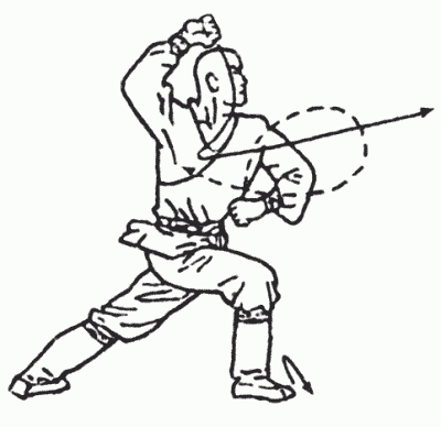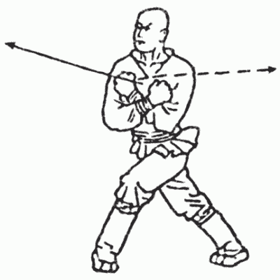 2. Не останавливаясь, нанести правой рукой удар вперед, сохраняя при этом чуть согнутым локоть и располагая предплечье горизонтально. Удар произвести на уровне живота, разворачивая кулак «сердцем» влево и «глазом» вверх. В это же время отвести левую ладонь со встречным движением вправо и назад к правому плечу. Смотреть вперед (рис. 38).