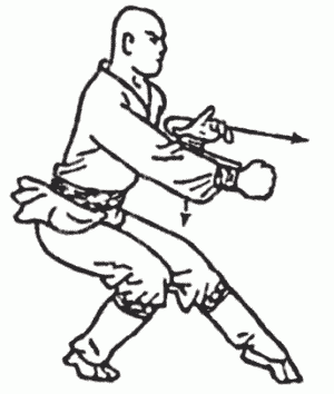 1. Сделать правой ногой «втыкающийся» шаг, ставя ее сзади левой стопы, слегка согнуть колени и принять стойку «вора». Одновременно поднять правый кулак к левому плечу, а затем опустить вниз, нанося при этом «расплющивающий» удар «ободом» кулака на уровне бедра и располагая кулак «сердцем» внутрь. Левую кисть сжать в кулак и отвести на пояс. Смотреть на правый кулак (рис. 39).