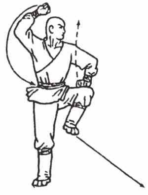 Повернуться вправо на 90°, опереться на выпрямленную в колене правую ногу. Левую ногу согнуть в колене и поднять вверх, оттягивая стопу носком к себе. Принять стойку на правой ноге. Одновременно описать левым кулаком дугу вверх, влево и вниз, переводя его в «опрокинутое» положение «сердцем» вниз над левым коленом. Правый кулак поднять вправо и вверх в «подпирающее» положение справа над головой. Смотреть влево (рис. 141).