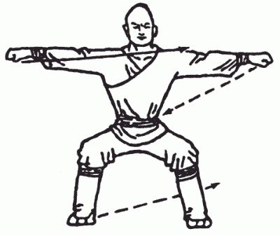 1. Отставить на шаг влево левую ногу, согнуть колени и принять стойку мабу. Одновременно развернуть обе руки наружу вокруг их осей так, чтобы направить локти вниз, «сердца» кулаков – внутрь, «обода» кулаков – друг к другу. Кулаки расположить перед грудью. Смотреть вперед (рис. 23).
